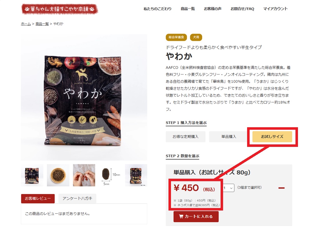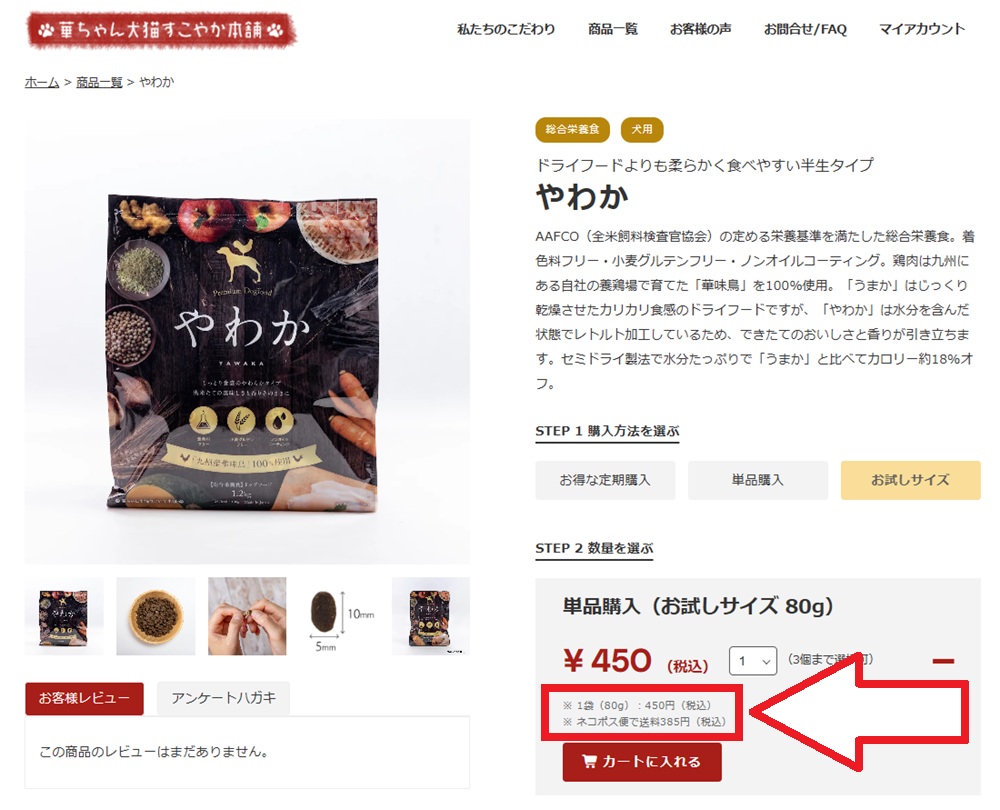やわかドッグフード公式サイトのお試しは450円という安さに目を引かれますが、じつは送料が別途385円必要になってきます。