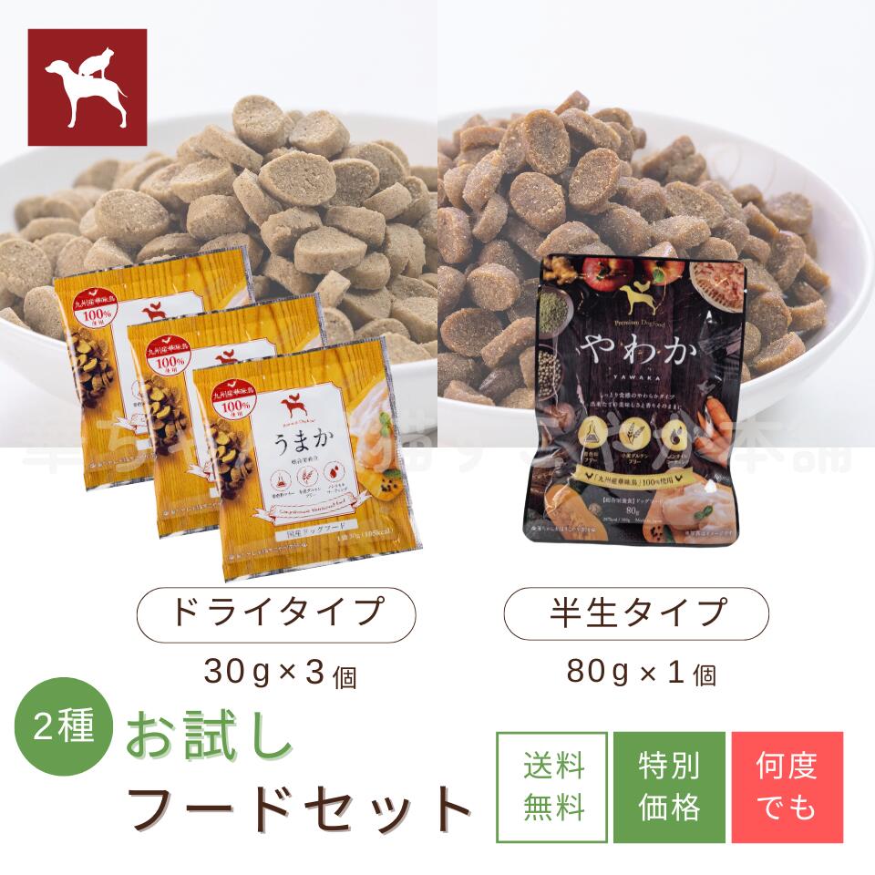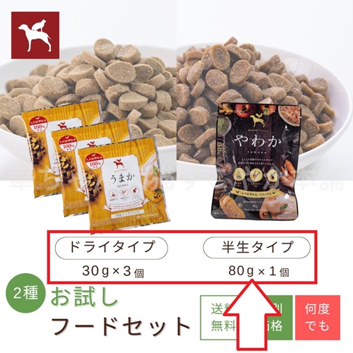 ちょっと前までは「やわかドッグフード」は80g×2袋を500円 (税込み・送料無料)でお試しすることができたのですが、残念ながら今は終了したみたいです。