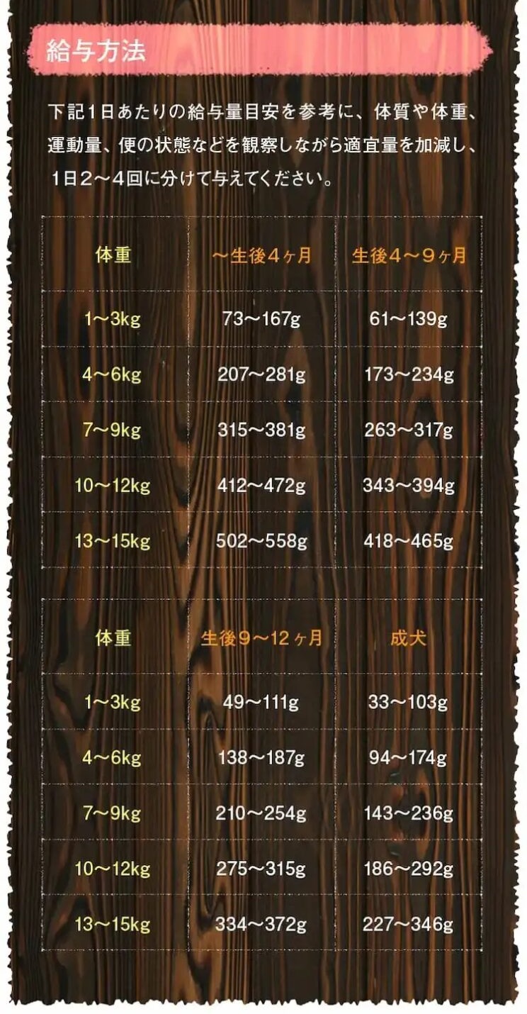 公式サイトの給餌量を見てみると、小型犬に食べさせた場合でも1日分としては心もとない感じです。