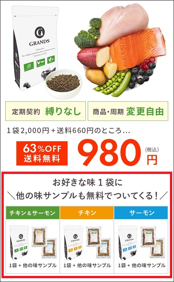 厳選された素材が使われて、健康にこだわって開発されて、徹底した安全管理で作られた高級ペットフードがたった980円でお試しできるのはグランツ(GRANDS)以外のフードではなかなか考えられません。