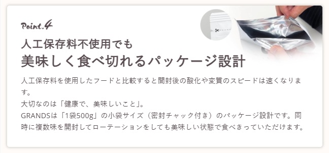 GRANDS(グランツ)のフードは人工保存料を使っていないので、安いフードに比べると開封後の酸化や変質がどうしても早くなってしまいますがこれで心配ご無用ですね。