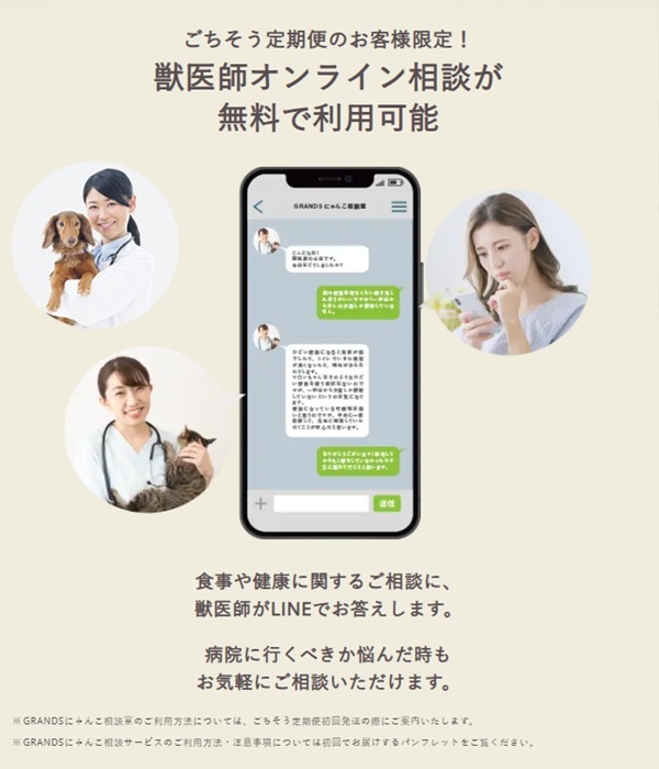 GRANDS(グランツ)の定期コースを利用している方限定になってしまいますが、無料で獣医師にオンライン相談ができます。